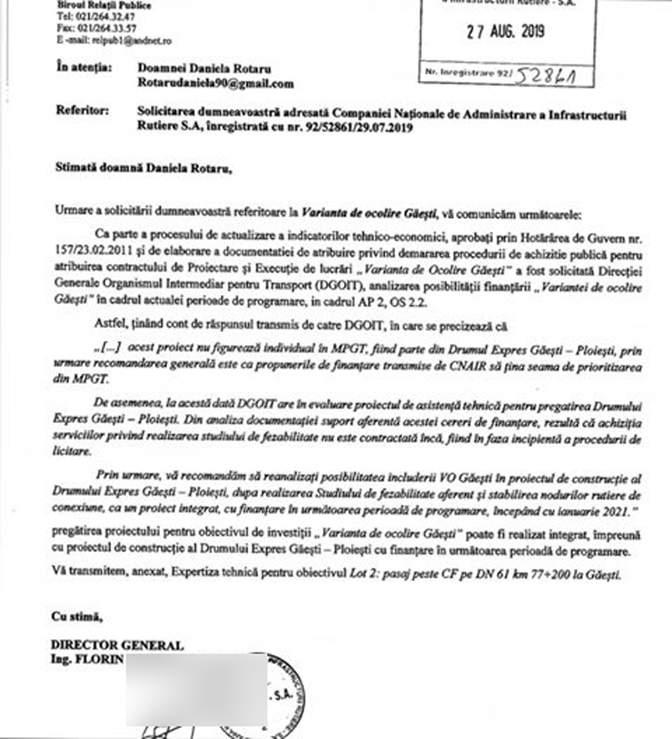 „În luna august mi-au trimis răspuns că ANAP le-a recomandat să includă varianta ocolitoare Găeşti în proiectul drumului expres Găeşti-Ploieşti. La sfârșitul lunii octombrie, mi-au răspuns că nu derulează niciun proiect care să vizeze varianta ocolitoare Găeşti. Pe 15 noiembrie mi-au scris că au trimis către ANAP documentația spre publicare în SEAP pe 14.03.2019. Această documentație nu este nici acum publică în SEAP, deşi au trecut opt luni şi jumătate. Problema este că nu derulează niciun proiect nici care să vizeze drumul expres Găeşti-Ploieşti, în care trebuie inclus proiectul variantă ocolitoare Găeşti.