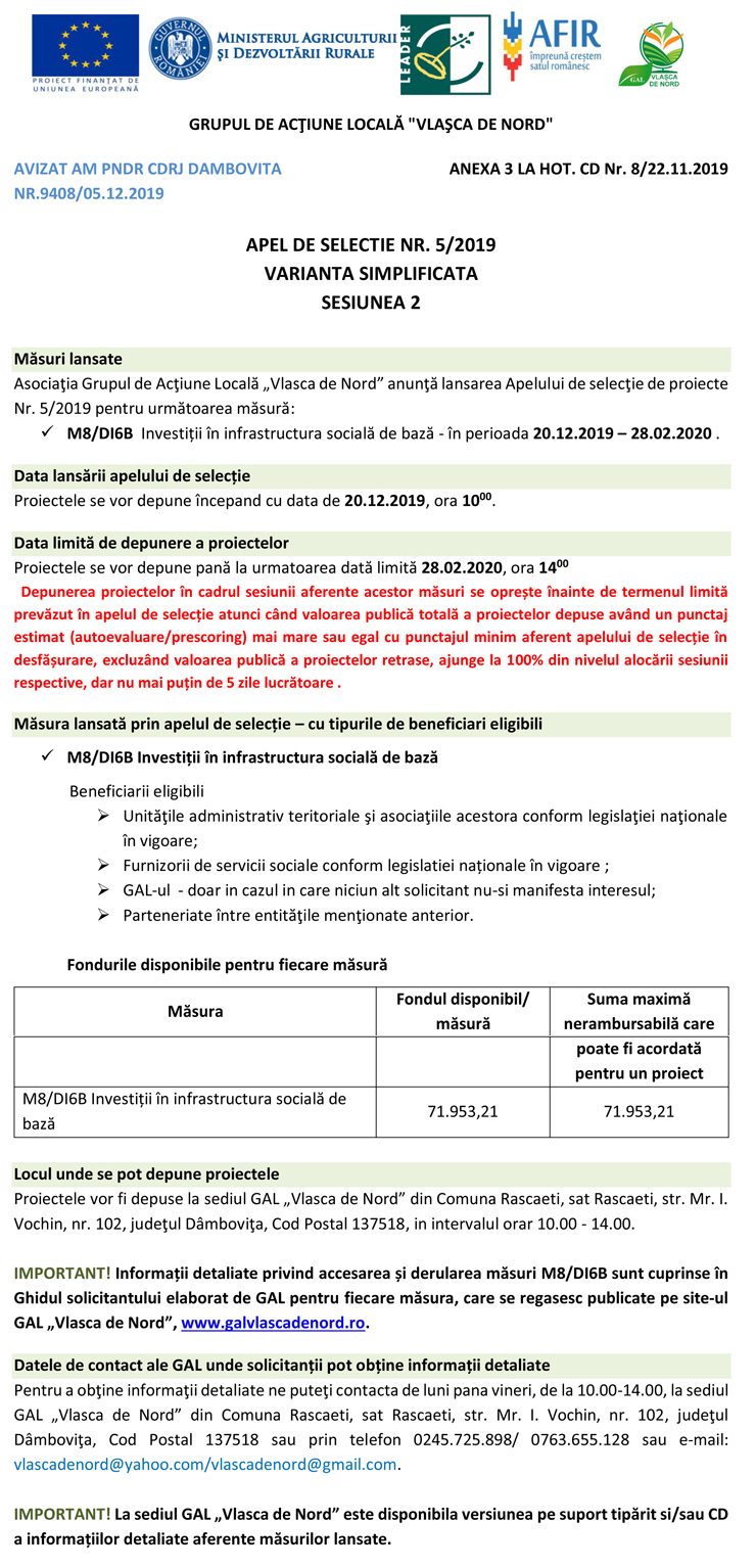 Grupul de Acţiune locală „Vlaşca de Nord”: Apel de selecţie nr. 5/2019