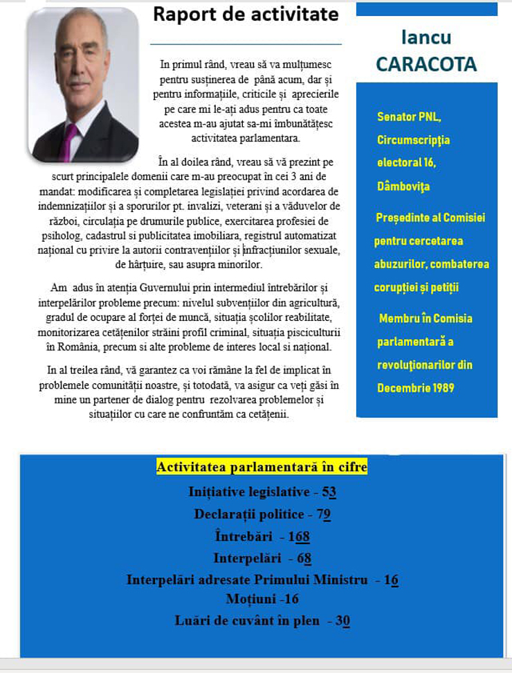 A debutat, luna aceasta, o nouă sesiune parlamentară, ultima din mandatul 2016-2020. Aşa cum ne-a obişnuit, senatorul PNL de Dâmboviţa Iancu Caracota a făcut public un raport al activităţii depuse.