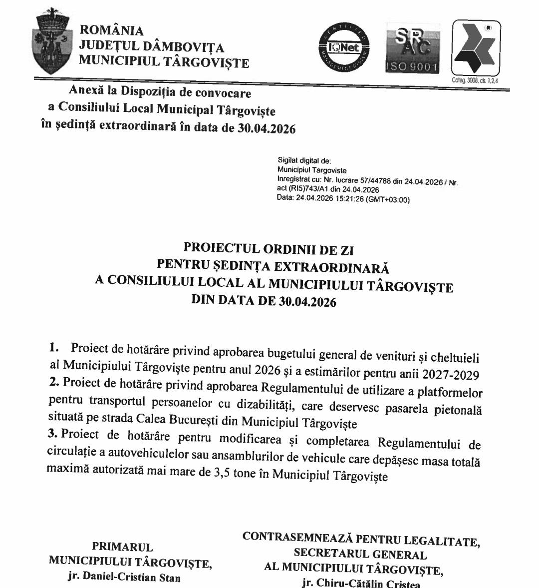 Consiliul Local Municipal Târgoviște se va întruni, joi – 30 aprilie 2026, în ședință extraordinară de lucru, începând cu ora 09:00, având înscrise pe ordinea de zi următoarele proiecte de hotărâre: