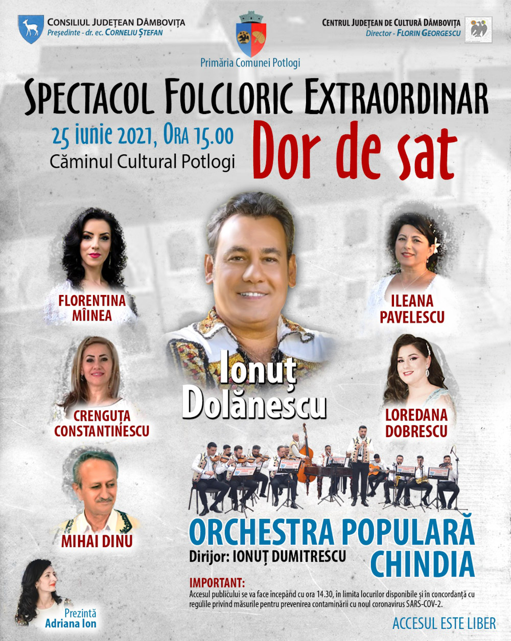 Vineri – 25 iunie 2021, de la ora 15:00, Consiliul Județean Dâmboviţa, Centrul de Cultură și Primăria Potlogi organizează, cu prilejul inaugurării căminului cultural din localitate, spectacolul folcloric „Dor de sat”, susținut de către Orchestra Populară „Chindia”.