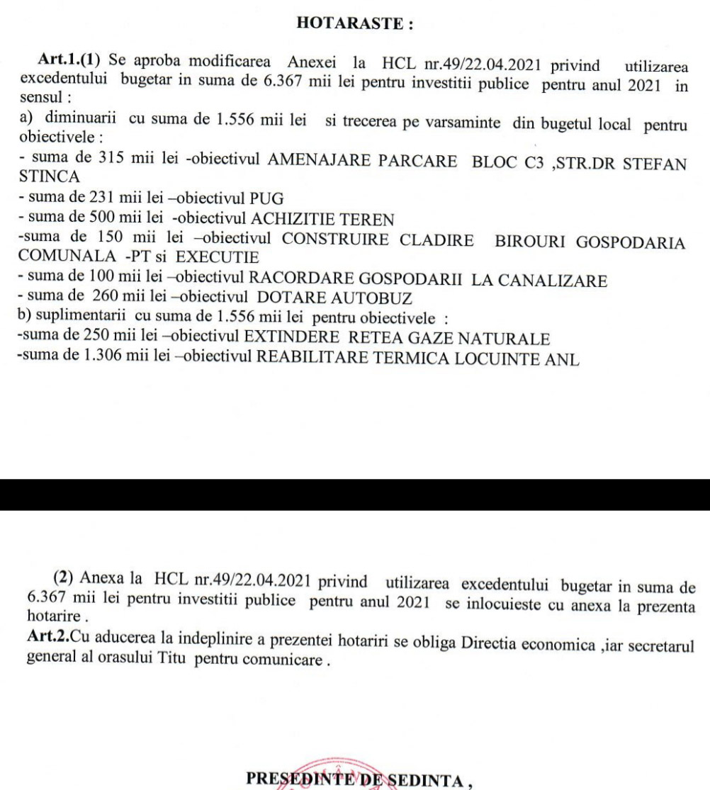 Consiliul Local Titu a aprobat utilizarea excedentului bugetar, în sumă de 6 367 mii lei, pentru realizarea mai multor obiective de investiții publice. Recent, aleșii au modificat hotărârea inițială, în sensul suplimentării bugetului alocat pentru extinderea rețelei de gaze naturale și reabilitarea termică a unor locuințe ANL.