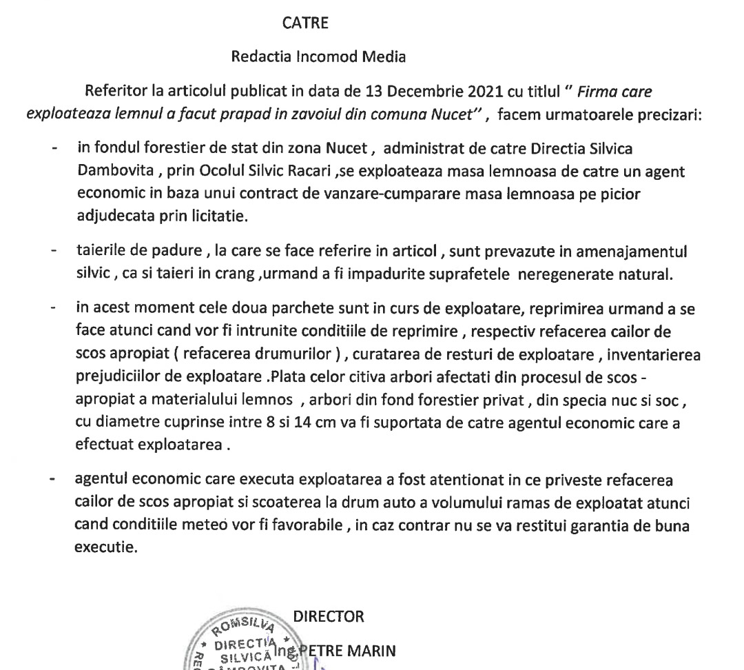 Direcția Silvică Dâmbovița, precizări cu privire la exploatarea lemnului din zăvoiul Nucet