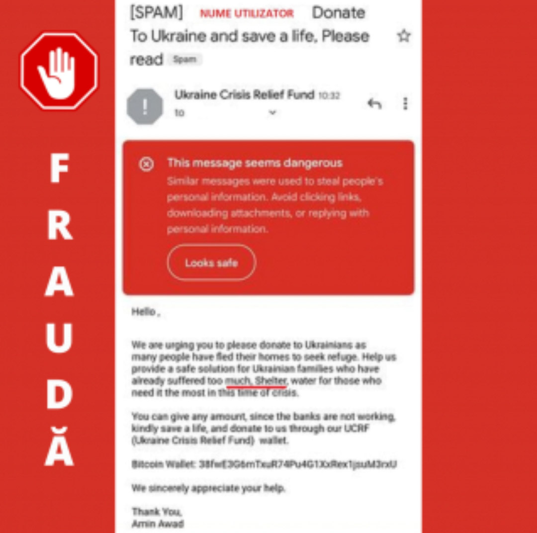Directoratul National de Securitate Cibernetică (DNSC), instituție în subordinea Guvernului României, a emis o notificare cu privire la apariția unor campanii de tip fraudă, care exploatează situația din Ucraina. Mesajul este distribuit prin email și face apel la strângerea de fonduri pentru refugiații care fug din calea războiului din Ucraina prin Ukraine Crisis Relief Fund, iar metoda propusă de transmitere a banilor este un portofel de Bitcoin – informează DNSC.