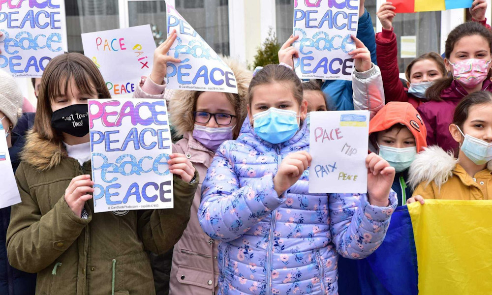 Elevii din clasele primare, alături de profesori, au ieșit în curtea școlii pentru a rosti rugăciuni pentru pacea întregii lumi și au citit mesaje de solidaritate.