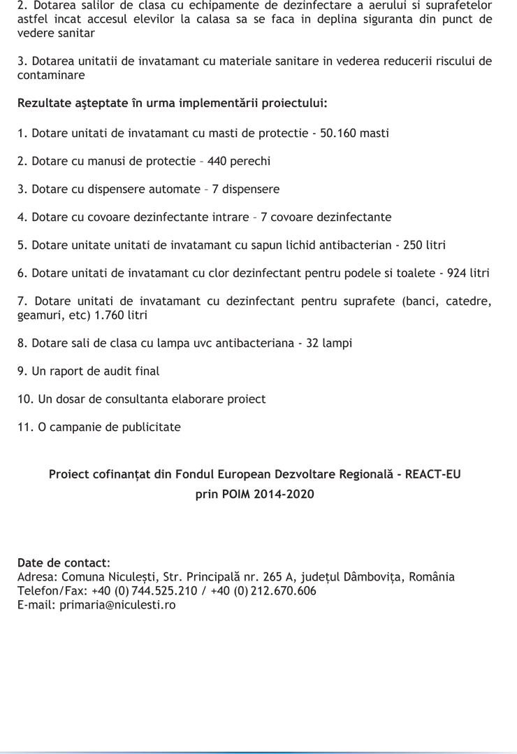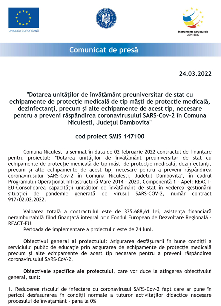 Primăria Niculești, anunț începere proiect cod SMIS 147100