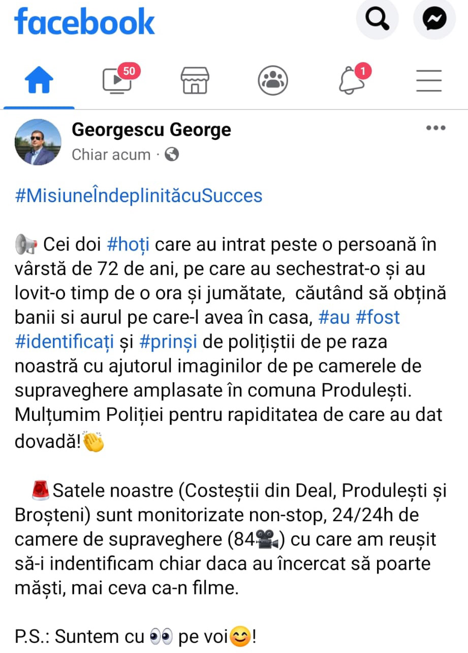Indivizii au fost dibuiți cu rapiditate, chiar dacă își acoperiseră fetele, cu ajutorul imaginilor surprinse de camerele de supraveghere pe care le-a instalat Primăria în comună. Anchetatorii nu au oferit niciun fel de informații despre acest caz. Nici măcar acum când i-au săltat pe agresori! Primarul George Georgescu este cel care a anunțat că tâlharii au fost prinși.