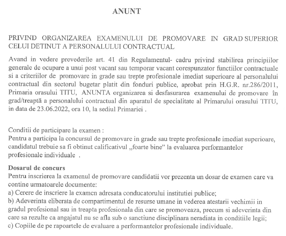 Primăria Titu, din județul Dâmbovița, organizează, în data de 23 iunie 2022, începând cu ora 10:00, examen pentru personalul contractual din administrația publică locală care dorește să promoveze în gradul profesional superior celui deținut.