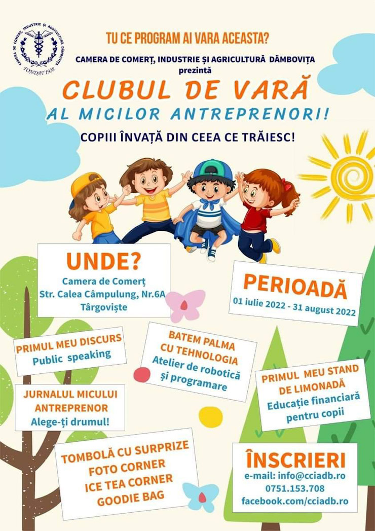 Camera de Comerț, Industrie și Agricultură Dâmboviţa organizează, în perioada 1 iulie – 31 august 2022, Clubul de vară al municipiului color antreprenori, destinat copiilor cu vârste între 6 și 10 ani.