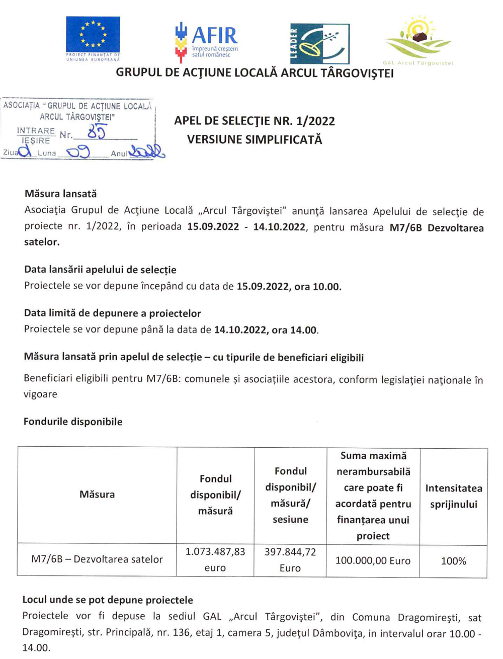 GAL „Arcul Târgoviștei”: Apel de selecție nr. 1/2022, varianta simplificată
