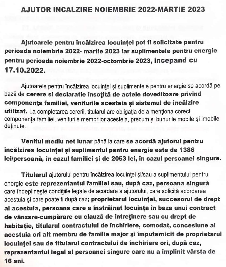 Primăria Salcioara, informare privind ajutorul de încălzire și suplimentul pentru energie electrică