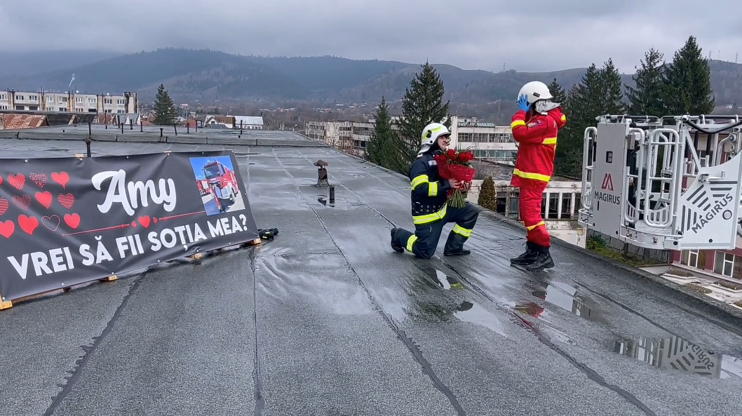 S-a întâmplat la înălțime, pe o clădire din zona fostei platforme ARO Câmpulung. El, George – maistru militar în cadrul Serviciului Logistic. Ea, Ana (Amy) – paramedic la Detașamentul de Pompieri Bradu. Martori și complici – militarii de la ISU Argeș.