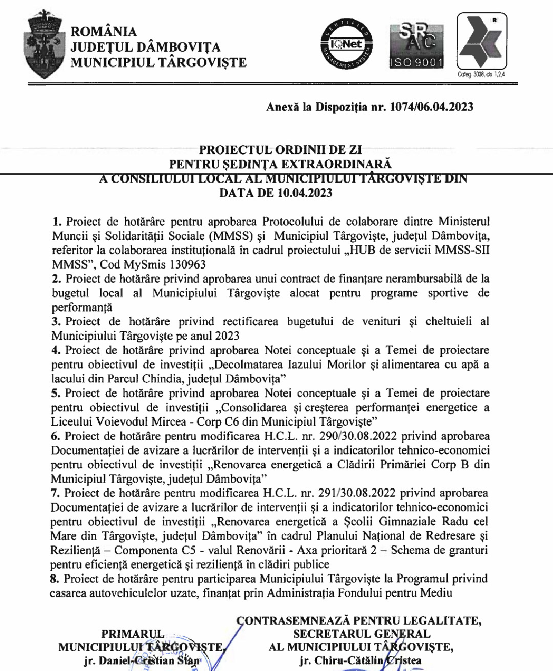 Ordinea de zi a ședinței CLM Târgoviște din 10 aprilie 2023