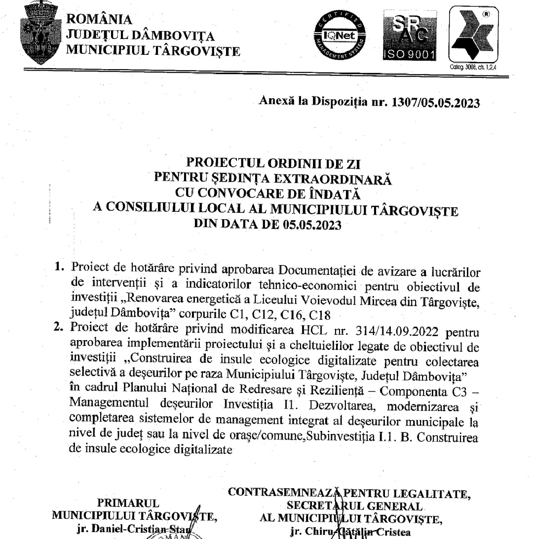 Consiliul Local Municipal Târgoviște se întrunește, vineri – 5 mai, de la ora 08:30, în ședință extraordinară de lucru, având următoarea ordine de zi: