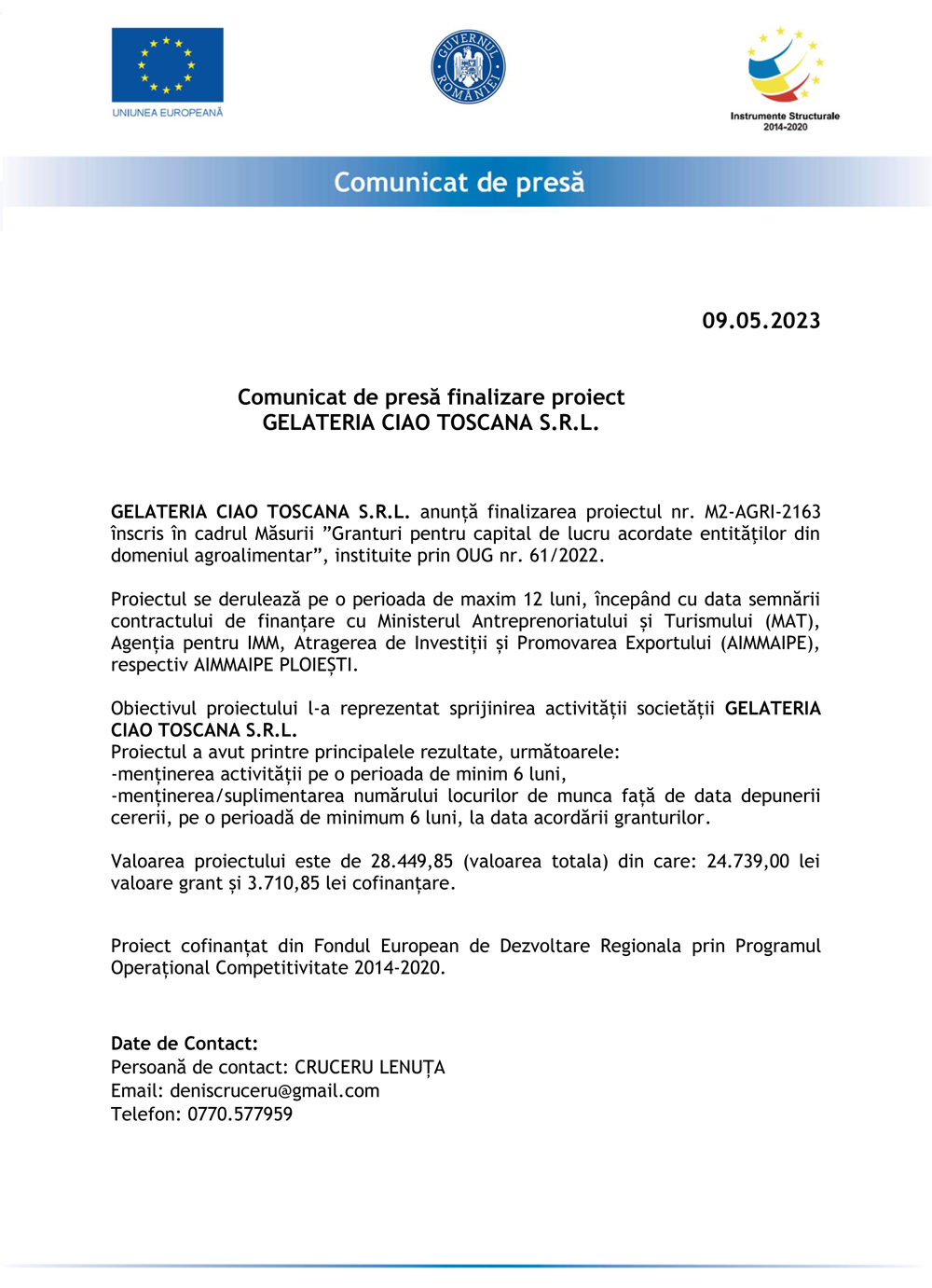 Comunicat de presă finalizare proiect GELATERIA CIAO TOSCANA S.R.L.