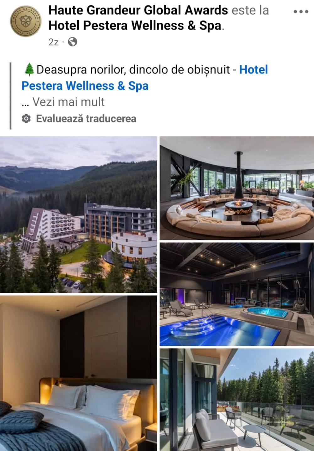 „Deasupra norilor, dincolo de obișnuit – Hotel Peștera Wellness & Spa” este titlul textului promovator postat pe pagina „Haute Grandeur Global Awards”
