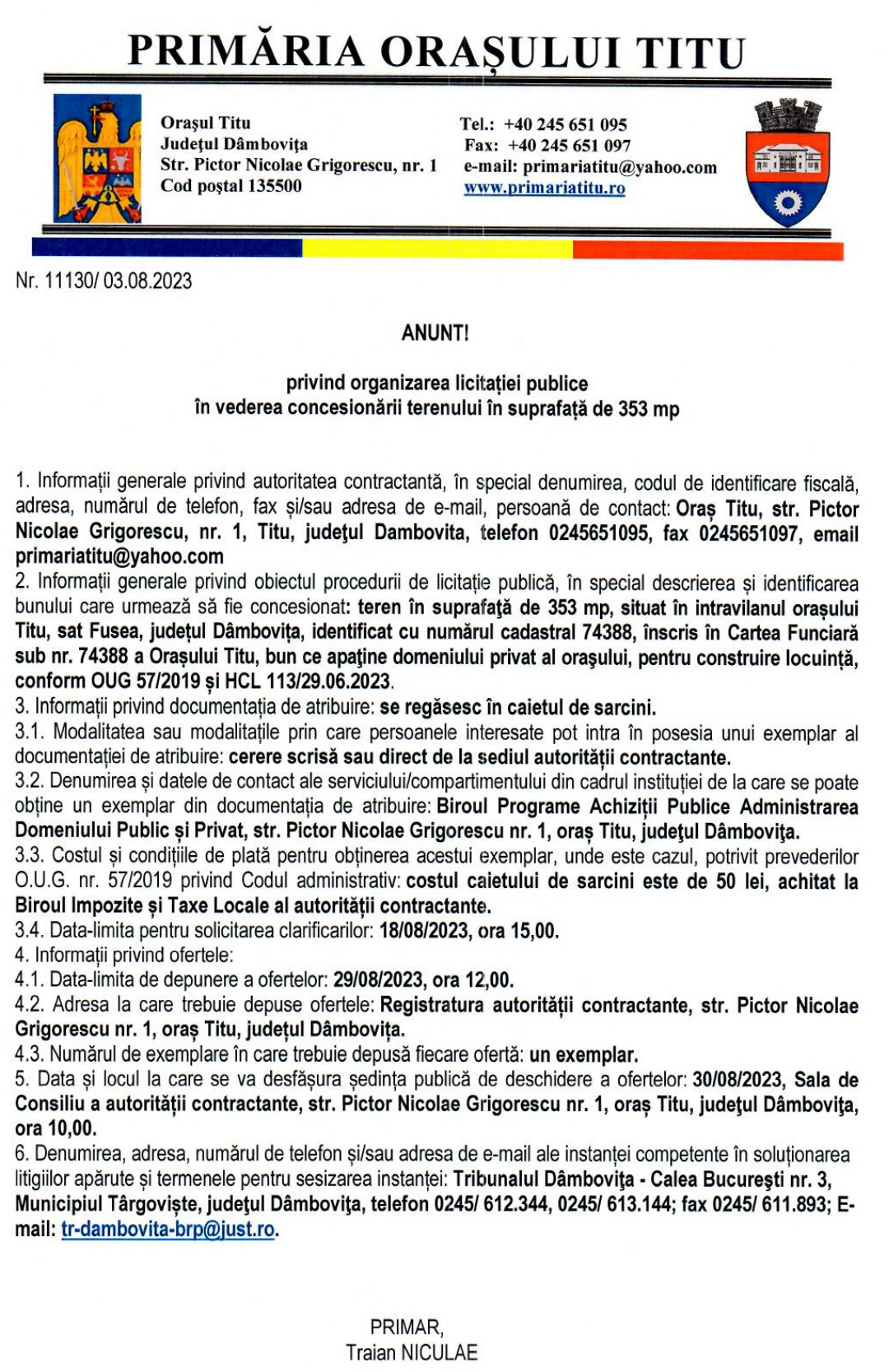 Primăria Titu, județul Dâmbovița, organizează licitație publică, în data de 30 august 2023, ora 10:00, licitație publică pentru concesionarea unui teren intravilan în suprafață de 353 mp, situat în Fusea. Data limită pentru depunerea ofertelor este 29 august 2023, ora 12:00. Clarificări se pot solicita până în ziua de 18 august 2023, ora 15:00.