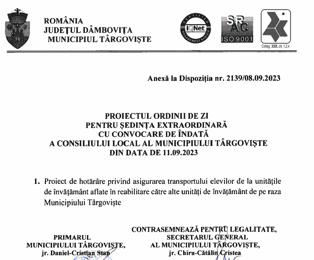 Consiliul Local Municipal Târgoviște se întrunește, luni – 11 septembrie 2023, de la ora 08:15, în ședință extraordinară de lucru cu convocare de îndată, având următoarea ordine de zi: