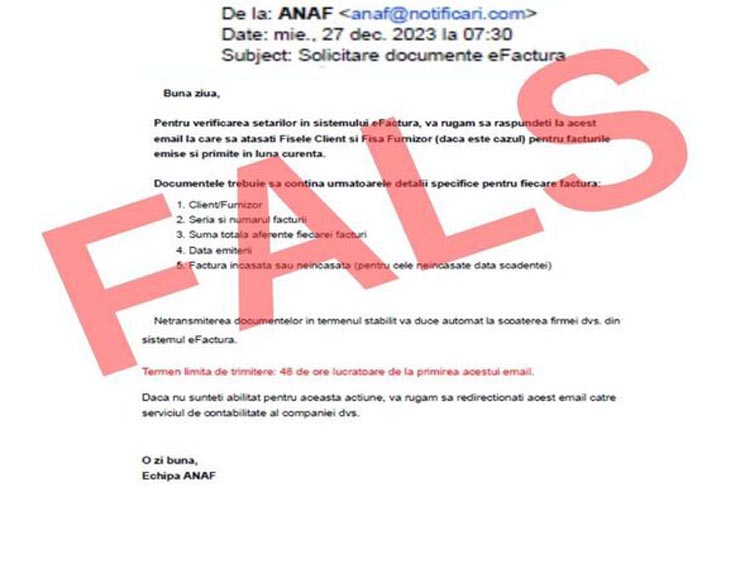 Agenția Națională de Administrare Fiscală atenționează firmele cu privire la o campanie de emailuri false, în numele instituției, prin care li se solicită „Fișele Client și Fișa Furnizor (dacă este cazul) pentru facturile emise și primite în luna curentă, pentru verificarea setărilor în sistemul eFactura”.