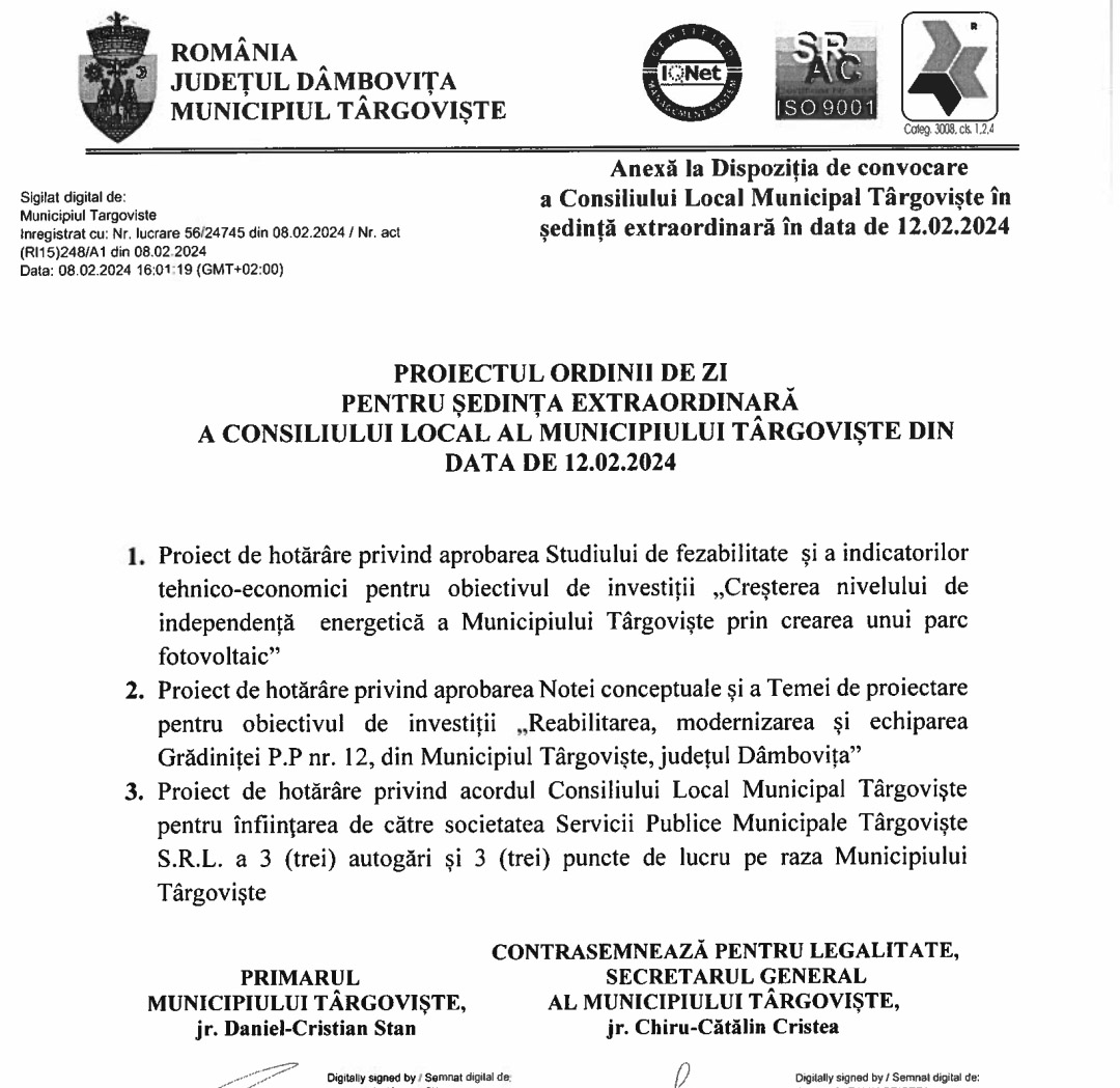 Consiliul Local Municipal Târgoviște se va întruni, luni – 12 februarie 2024, în ședință extraordinară de lucru de la ora 09:00, având pe ordinea de zi următoarele proiecte de hotărâre: