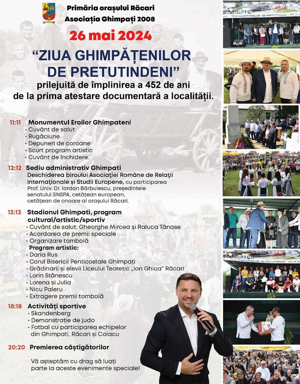 Duminică – 26 mai 2024, Primăria și Consiliul Local Răcari, județul Dâmbovița, organizează, în colaborare cu Asociația Ghimpați 2008, o serie de manifestări cultural-sportive, artistice și religioase prilejuite de împlinirea a 452 de ani de la prima atestare documentară a localității Ghimpați.