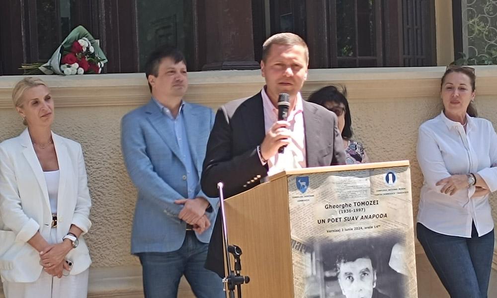 „De această dată, celebrăm figura unui poet important din secolul XX. Este vorba de Gheorghe Tomozei, care se naște în 1936. Prima întâlnire cu acest scriitor a fost când am citit cartea Miradoniz în care l-a făcut pe Mihai Eminescu nu numai un mare poet, ci un om în carne și oase care avea geniu. Apoi l-am revăzut la o celebră serată muzicală. L-am văzut la Școala Normală, cred că eram în clasa a zecea sau a unsprezecea, când a venit și s-a întâlnit cu tinerii de la un cenaclu literar. Deja semna așa cum o făcea Tolstoi, DMT. Dacă mai trăiesc. Simțea că moare. A decedat în 1997. Figura lui Gheorghe Tomozei este astăzi omagiată. O vreme a petrecut aici, la Târgoviște. A făcut liceul la Ienăchiță Văcărescu”, a precizat Ionuț Vulpescu.