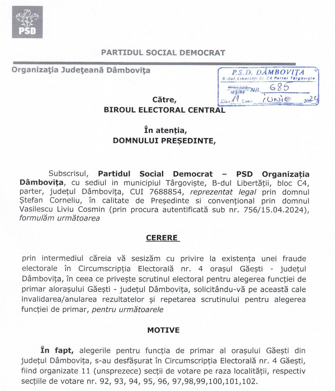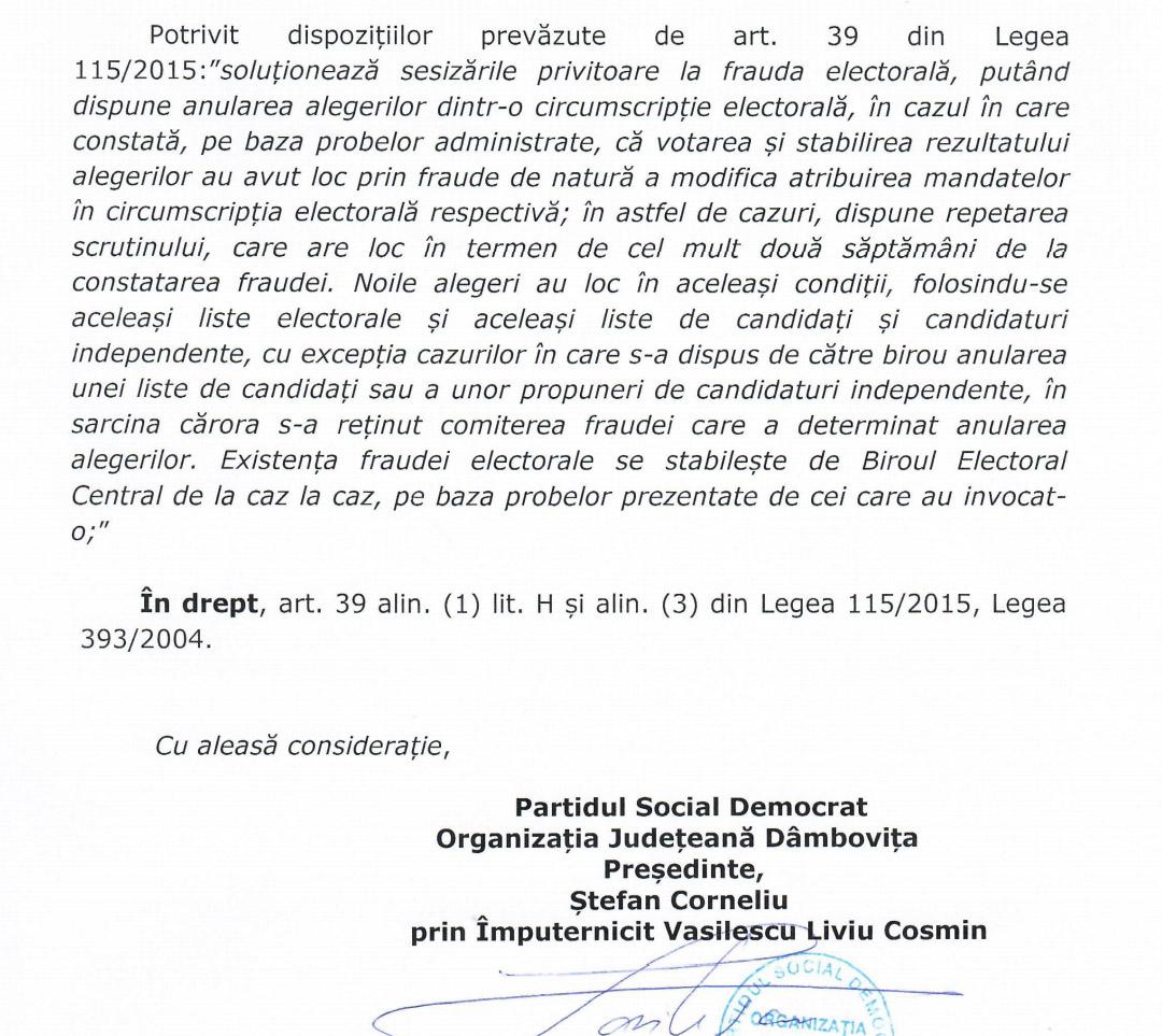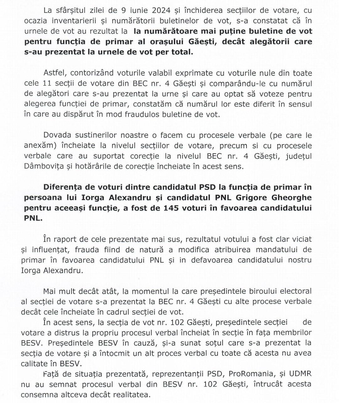Având în vedere că, prin dispariția acestor buletine de vot și prin distrugerea procesului-verbal, rezultatul alegerilor din 9 iunie de la Găești a fost clar viciat, PSD Dâmbovița solicită organelor competente aplicarea de urgență a măsurilor care se impun.