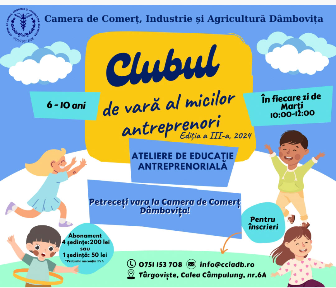 Alătură-te Clubului de Vară al Micilor Antreprenori de la Camera de Comerț Dâmbovița, unde copiii vor învăța, experimenta și dezvolta abilități esențiale pentru a deveni lideri de succes!