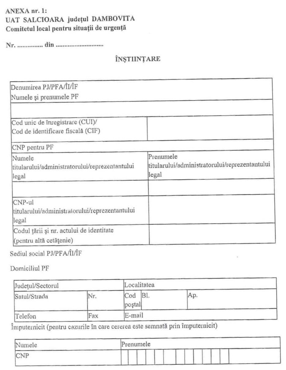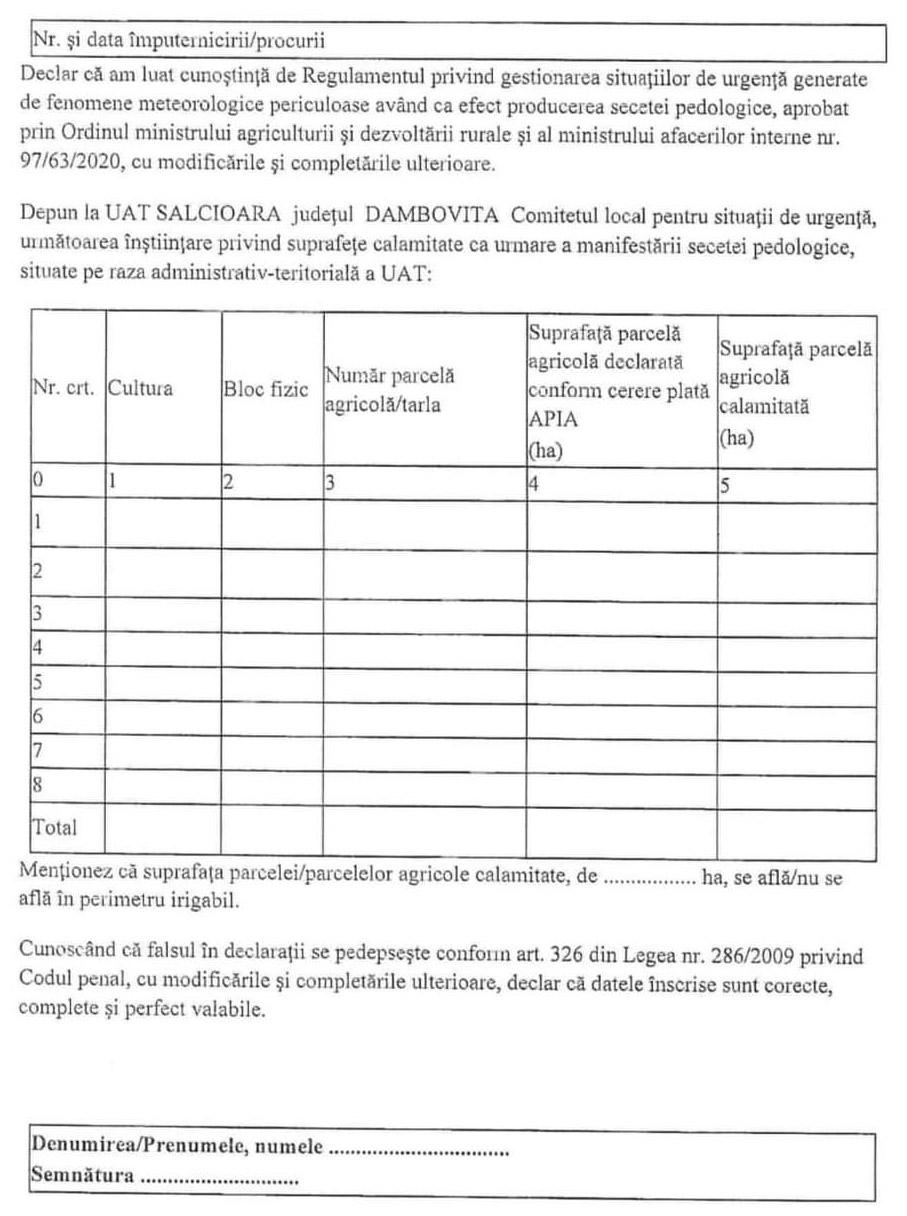 Primăria comunei Sălcioara, din județul Dâmbovița, îi anunță pe utilizatorii de terenuri cu destinație agricolă înscriși în evidențele Agenției de Plăți și Intervenție pentru Agricultură, ale căror suprafețe cu culturi agricole au fost calamitate în procent de peste 30%, că trebuie să depună înștiințări scrise la unitatea administrativ-teritorială pe a cărei rază se află terenul, în format fizic sau prin mijloace electronice de transmitere la distanță, până cel târziu la data de 1 august inclusiv, pentru culturile agricole înființate în toamnă, respectiv până cel târziu la data de 15 octombrie inclusiv, pentru celelalte culturi agricole.