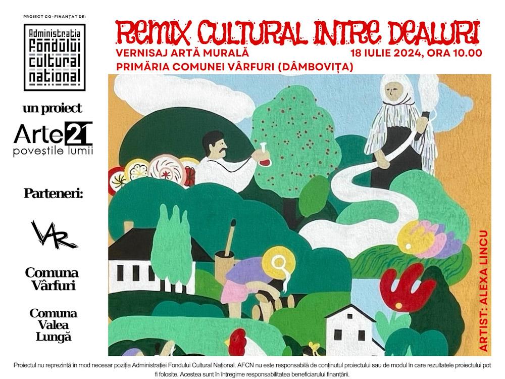 Proiectul cultural „Remix cultural între dealuri” desfășurat de Asociația ARTE 21 – Poveștile lumii se derulează în perioada martie – iulie 2024, în parteneriat cu Comuna Vârfuri, Comuna Valea Lungă și Asociația VAR, și este cofinanțat de Administrația Fondului Cultural Național.