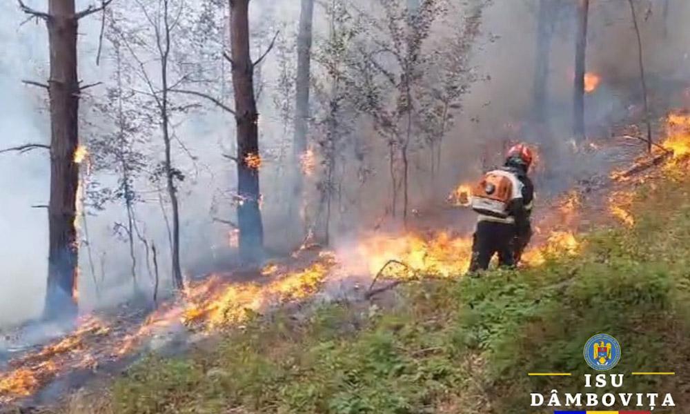 Pompierii din Dâmbovița acționează de mai bine de trei ore și jumătate pentru stingerea unui incendiu de vegetație uscată care se manifestă pe o suprafață de aproximativ 10 hectare de teren, într-o zonă împădurită a satului Scheiu de Sus, comuna Ludești.