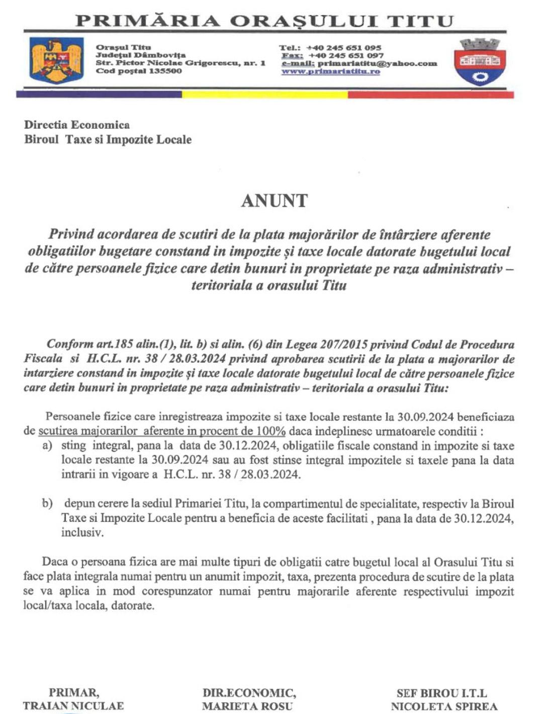 Primăria Titu, din județul Dâmbovița, îi scutește de plata majorărilor de întârziere pe toți contribuabilii care își achită integral, până la data de 30 decembrie 2024, taxele și impozitele restante.