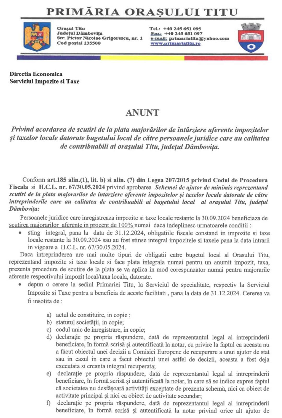 Primăria Titu: Firmele sunt scutite de majorările de întârziere până în 31 decembrie 2024