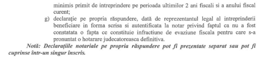 – declarație pe propria răspundere a reprezentantului legal, autentificată la notar, privind orice ajutor de minimis primit în ultimii 2 ani fiscali;