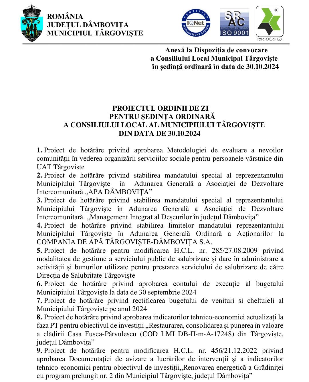 Ordinea de zi a ședinței CLM Târgoviște din 30 octombrie 2024