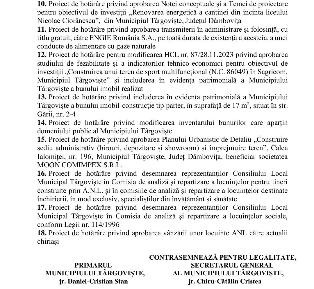 Consiliul Local Municipal Târgoviște se va întruni, miercuri – 30 octombrie 2024, în ședință ordinară de lucru de la ora 14:00, având înscrise pe ordinea de zi următoarele proiecte de hotărâre: