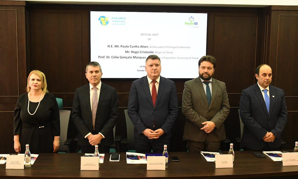 Excelența Sa, Paulo Cunha ALVES, Ambasadorul Portugaliei în România, a evidențiat ideea că instituțiile de învățământ superior din întreaga Europă constituie un teren fertil pentru schimburile academice bazate pe interculturalitate, ceea ce le oferă studenților, „viitori lideri ai Europei”, o perspectivă mai amplă asupra lumii și a identității comune. Totodată, Excelența Sa a adresat felicitări Rectorului Universității „Valahia” din Târgoviște, Prorectorului Universității Politehnice din Tomar, liderilor proiectului KreativEU, și reprezentanților orașului Târgoviște, pentru concretizarea înfrățirii dintre Municipiul Târgoviște și orașul Tomar. Acest lucru intensifică interacțiunile dintre locuitorii celor două orașe, și implicit, consolidarea legăturilor dintre Portugalia și România.