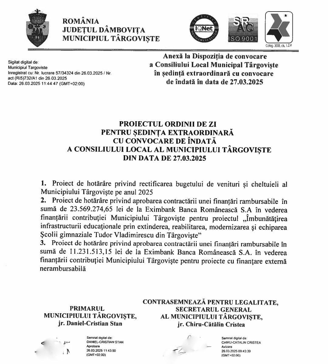 Consiliul Local Municipal Târgoviște se va întruni, joi – 27 martie 2025, de la ora 08:30, în ședință extraordinară de lucru, având înscrise pe ordinea de zi următoarele proiecte de hotărâre: