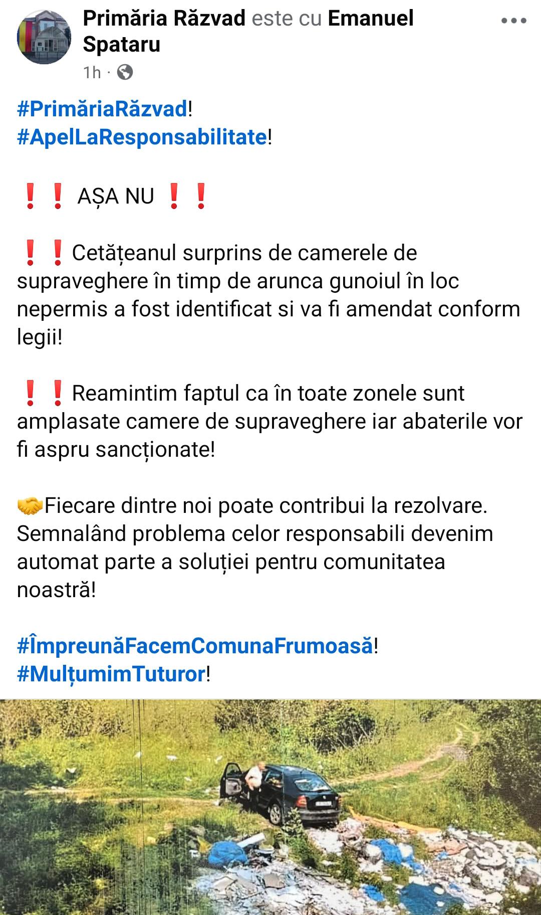 Camerele video instalate de Primăria Răzvad în toată comuna s-au dovedit încă o dată extrem de utile. Recent, un bărbat a fost surprins când arunca gunoi într-un loc nepermis și, datorită imaginilor înregistrate, a fost identificat și va fi amendat conform legii.