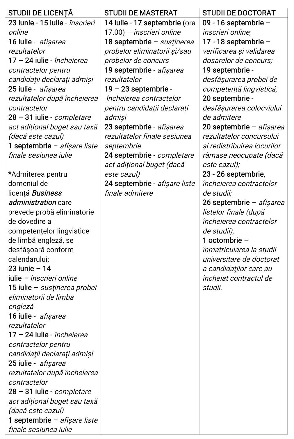 Concursul de admitere se desfășoară conform următorului calendar: