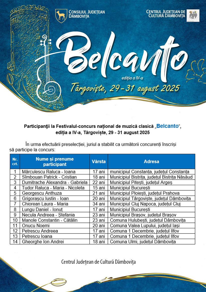 Au fost desemnați finaliștii Festivalului-Concurs Belcanto 2025, organizat la Târgoviște