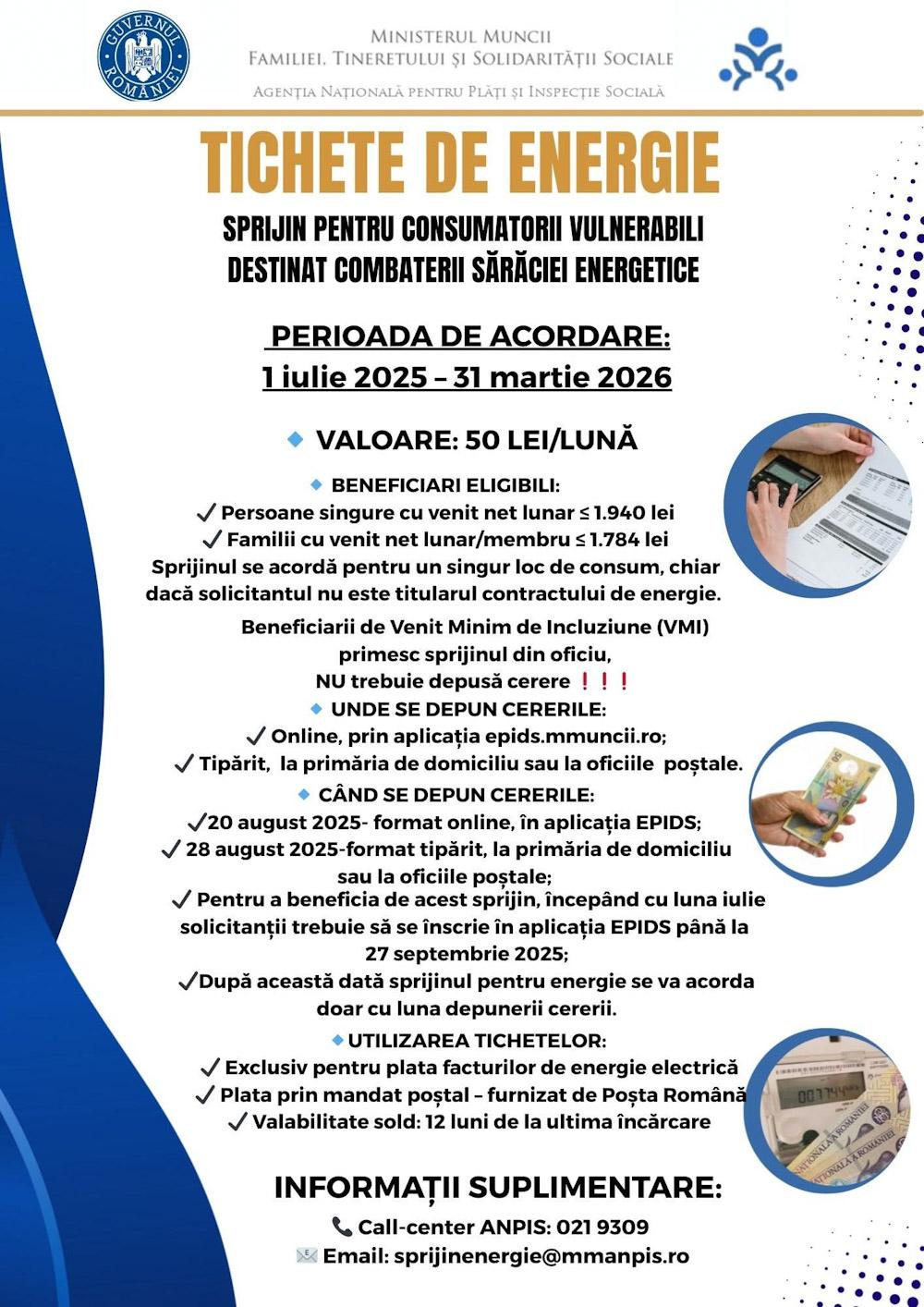 Primăria Poiana, din județul Dâmbovița, îi informează pe locuitorii comunei că, în această perioadă, se depun cereri pentru obținerea unui sprijin în cuantum de 50 lei lunar pentru plata energiei electrice. Tichetele de vor acorda pentru lunile iulie 2025 – martie 2026. Acestea se acordă pentru un singur loc de consum, chiar dacă solicitantul nu este titularul contractului de energie