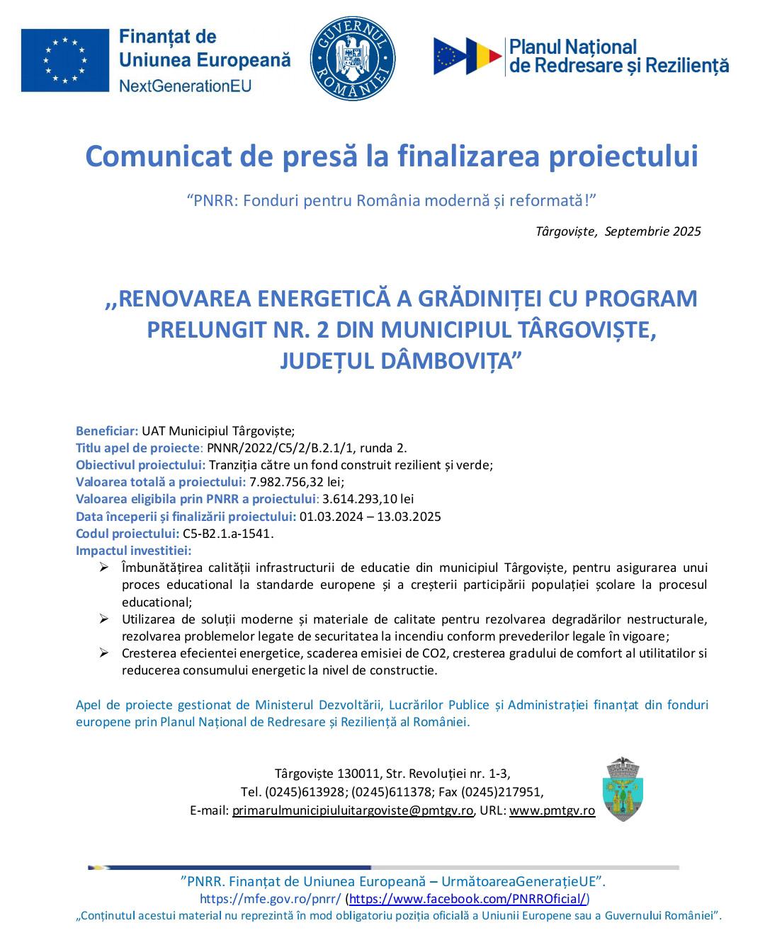 Primăria Târgoviște: Comunicat finalizare proiect „Renovarea energetică a Grădiniței cu program prelungit Nr. 2”