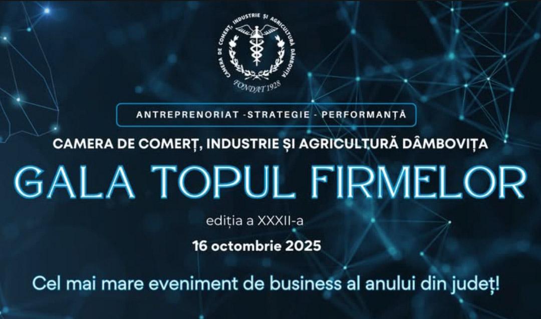 Gata „Topul Firmelor din Dâmbovița” se va desfășura în data de 16 octombrie 2025, la Ballroom Del Ponte din Târgoviște.