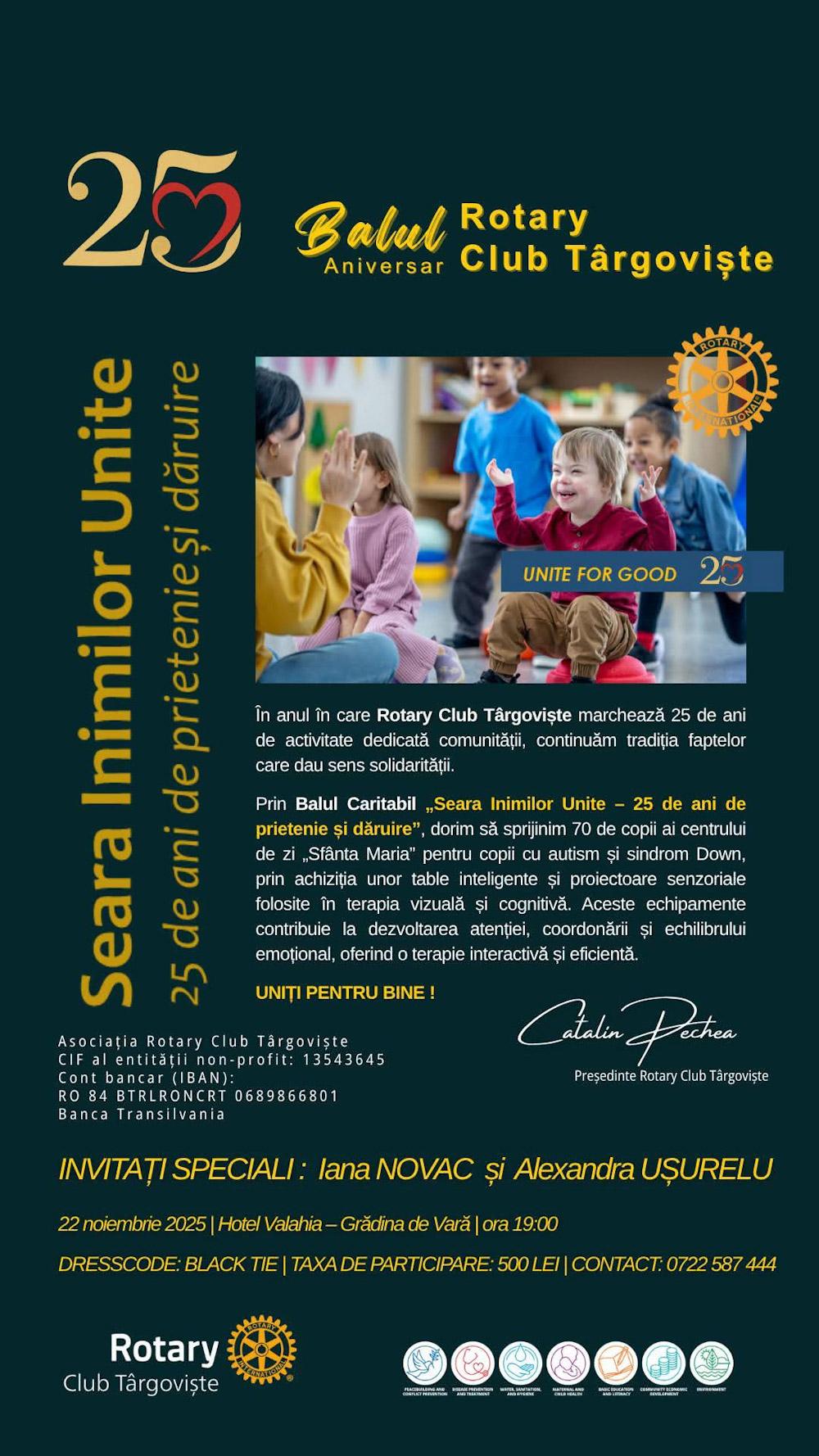 Rotary Club Târgoviște organizează, în data de 22 noiembrie 2025, tradiționalul bal caritabil, care va fi și unul aniversar, întrucât momentul coincide cu sărbătorirea a 25 de ani de existență a acestei asociații cu rol deosebit în sprijinirea comunităților, a excelenței în educație, a grupurilor sociale defavorizate, a instituțiilor medicale și, nu în ultimul rând, de promovare a activităților culturale, spirituale și sportive.
