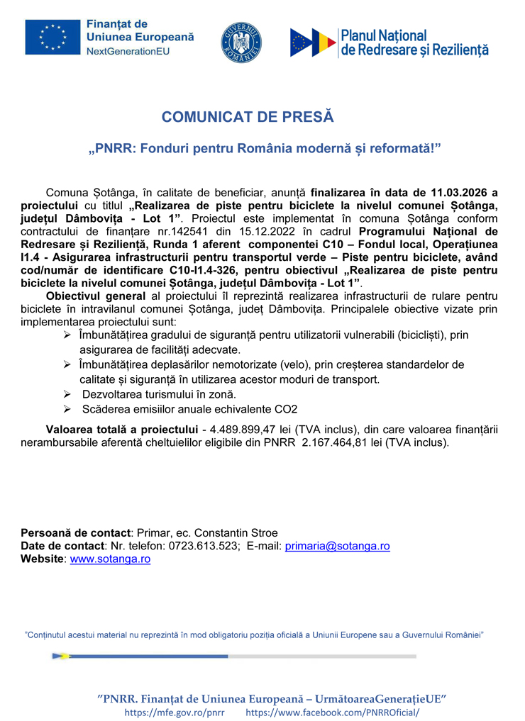Comuna Șotânga: Anunț finalizare proiect PNRR „Realizarea de piste pentru biciclete – lot 1”