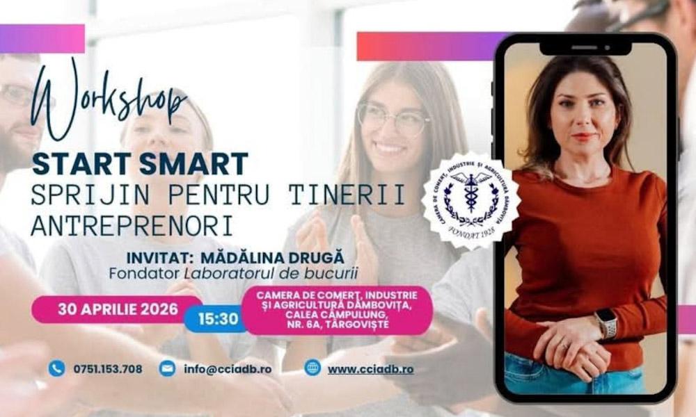 Camera de Comerț, Industrie și Agricultură Dâmbovița organizează, joi – 30 aprilie 2026, la sediul său din Târgoviște (Calea Câmpulung, nr. 6A), de la ora 17:30, un nou workshop sub titulatura „Start Smart: Sprijin pentru tinerii antreprenori”.
