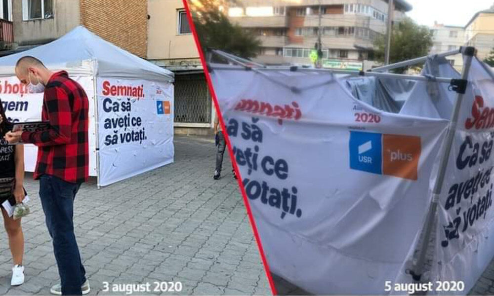 Cortul instalat de USR PLUS în zona Pieței 1 Mai din Târgoviște, pentru a strânge semnături de susținere a candidaților Alianței pentru Primăria Târgoviște și Consiliul...