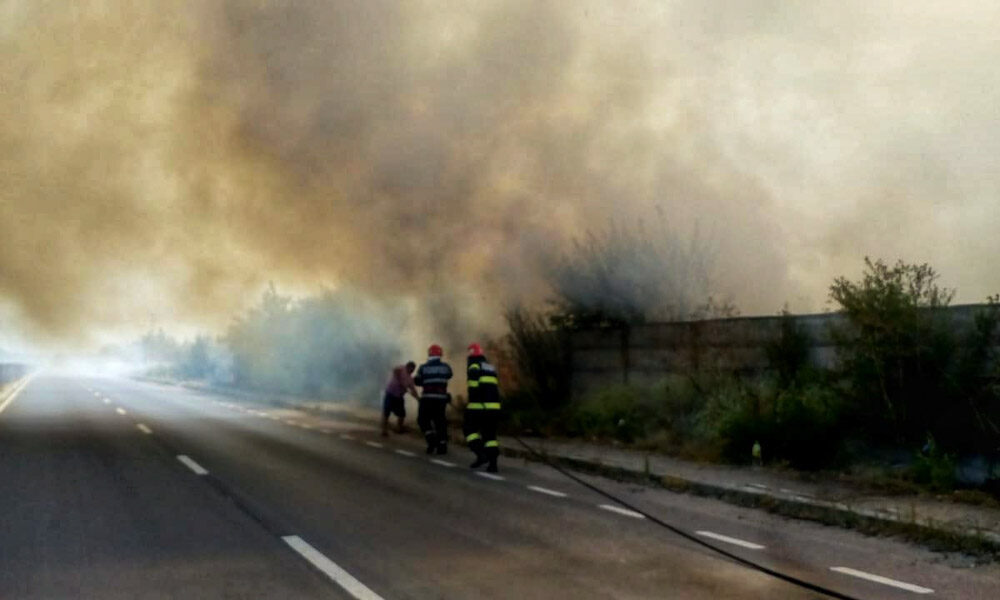 Coloane de mașini pe DN 5, în zona localității Uzunu, județul Giurgiu. Traficul rutier este îngreunat din cauza unui incendiu de vegetație care se manifestă pe...