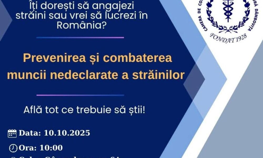 Camera de Comerț, Industrie și Agricultură Dâmbovița va organiza, vineri – 10 octombrie 2025, în parteneriat cu Biroul pentru Imigrări Dâmbovița și Inspectoratul Teritorial de Muncă,...